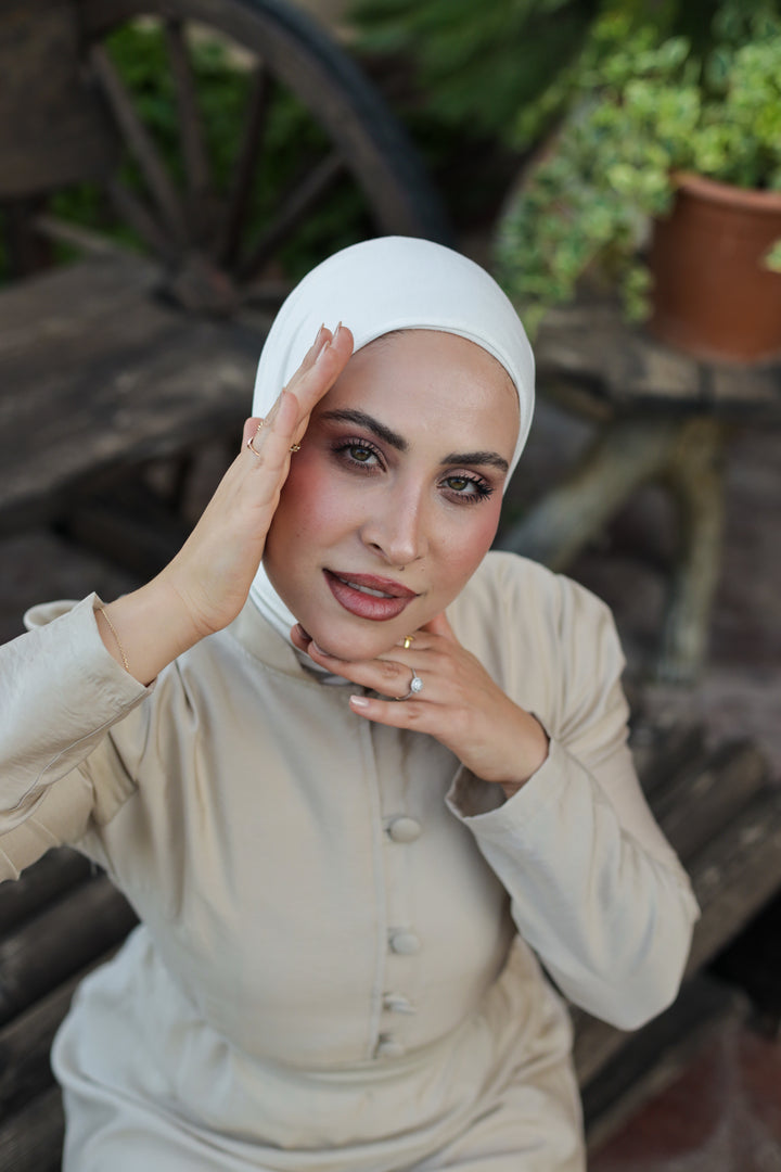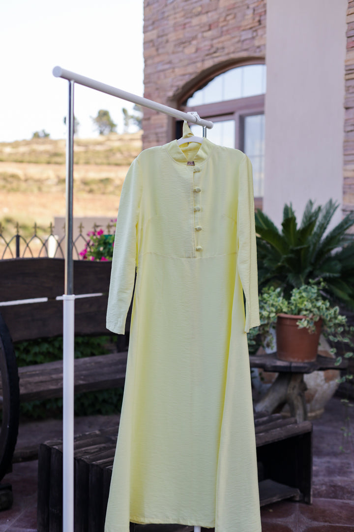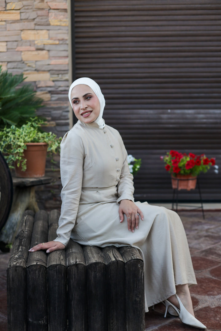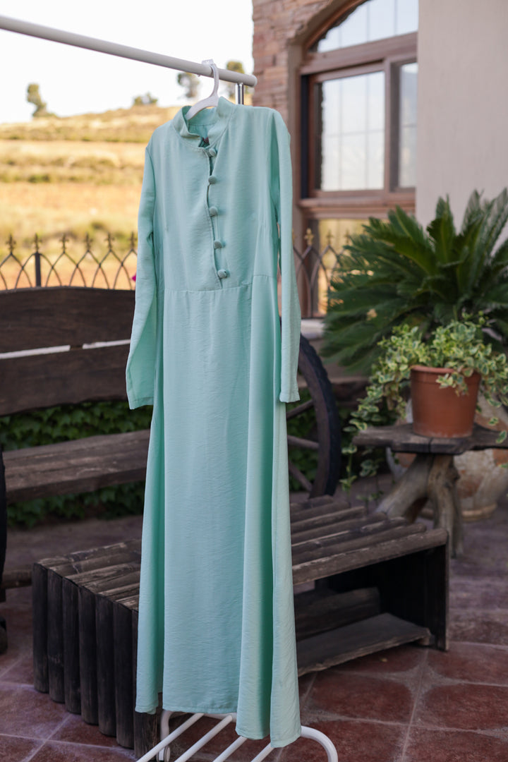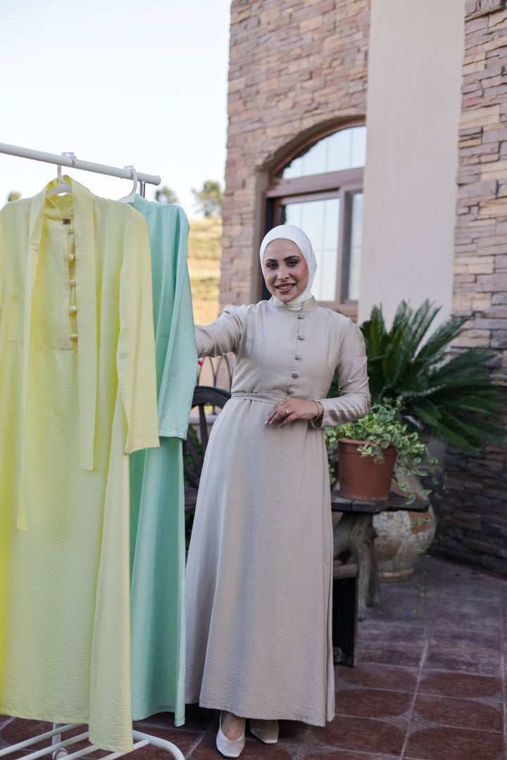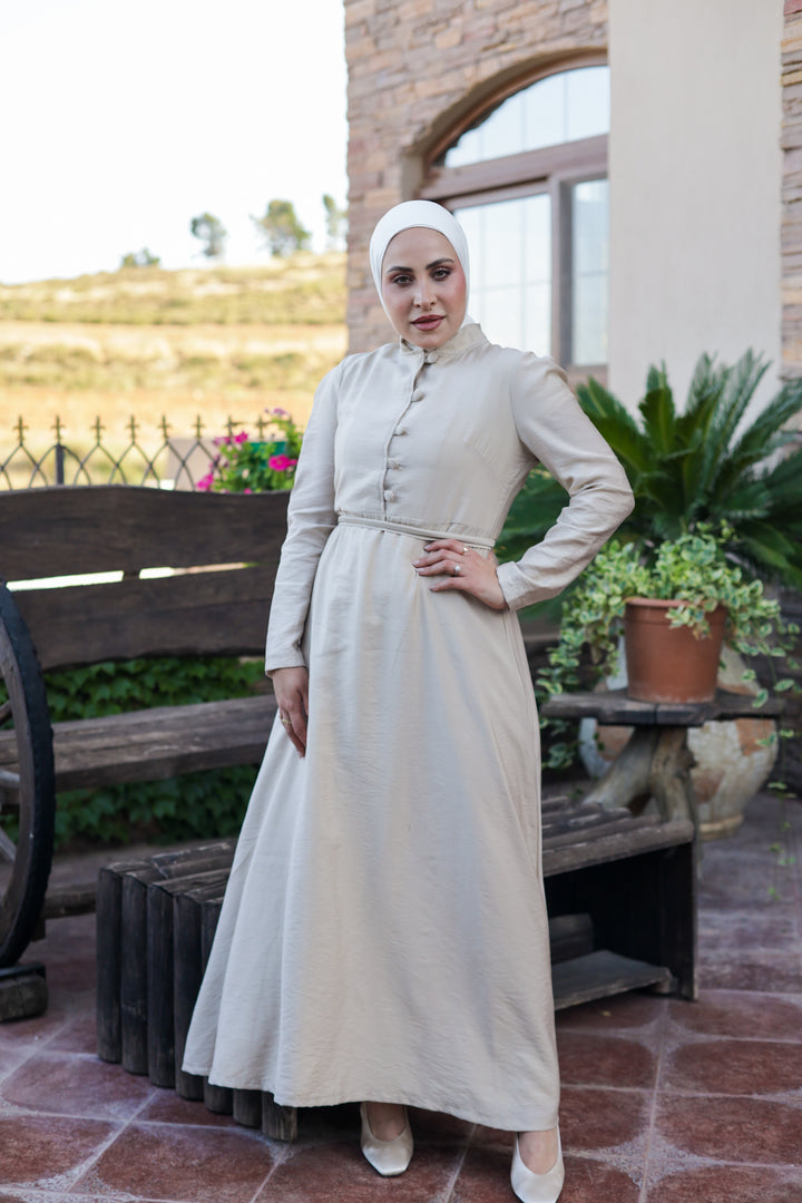 The Sakina is a figure-flattering, fitted dress featuring matching fabric-covered buttons and a soft, feminine silhouette.